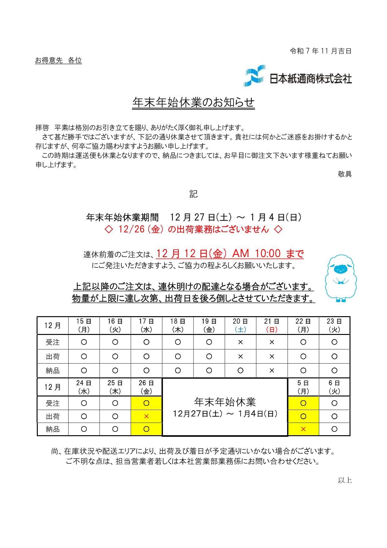 年末年始配送案内/新橋製紙品(ニイタカ品)ご購入のお客様