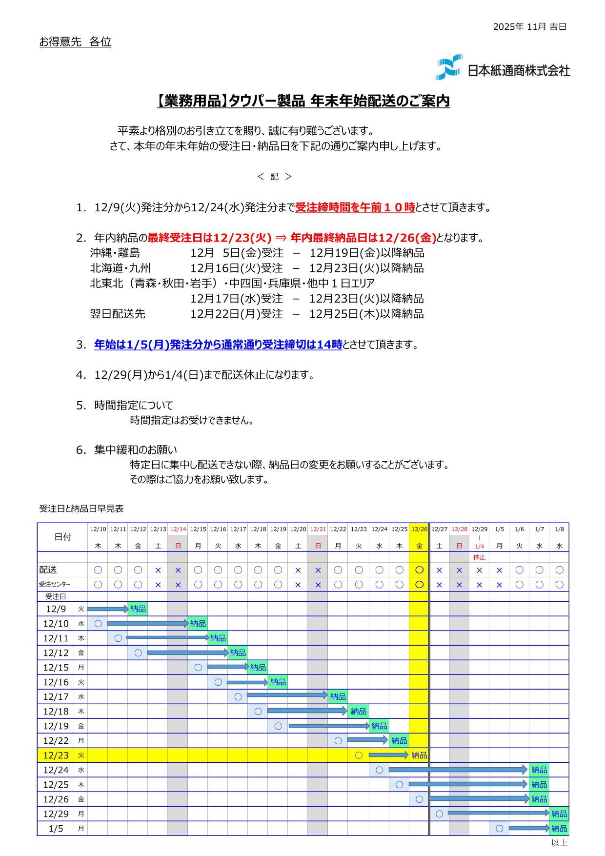 年末年始配送案内/新橋製紙品(ニイタカ品)ご購入のお客様